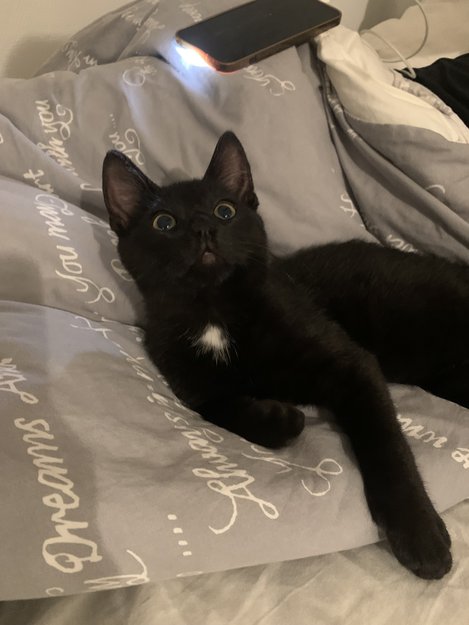 Helt svart kattunge til og med bartene. En flekk under haken.