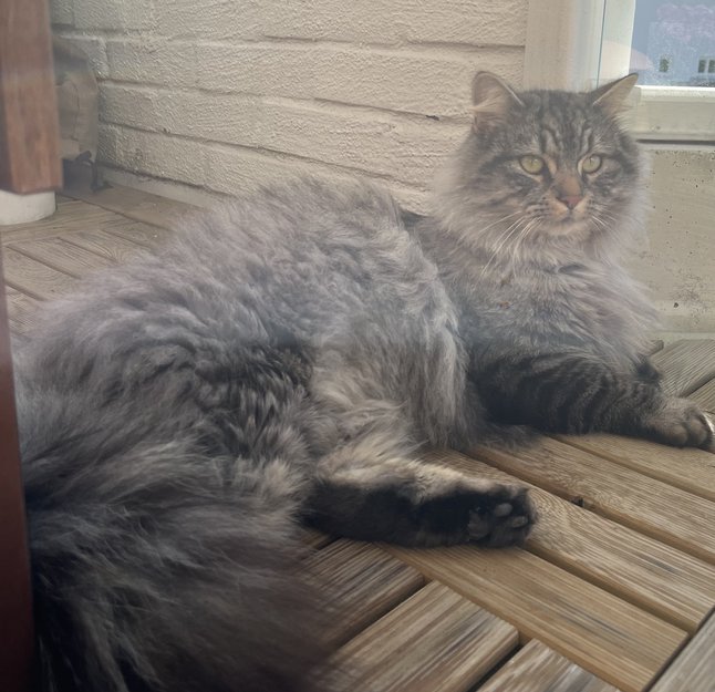 Stor hannkatt med lang, grå pels. Ikke kastrert.