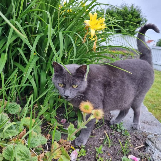 Grå, veldig myk pels, ser litt dårlig, kan ikke mjaue skikkelig, han piper istedet