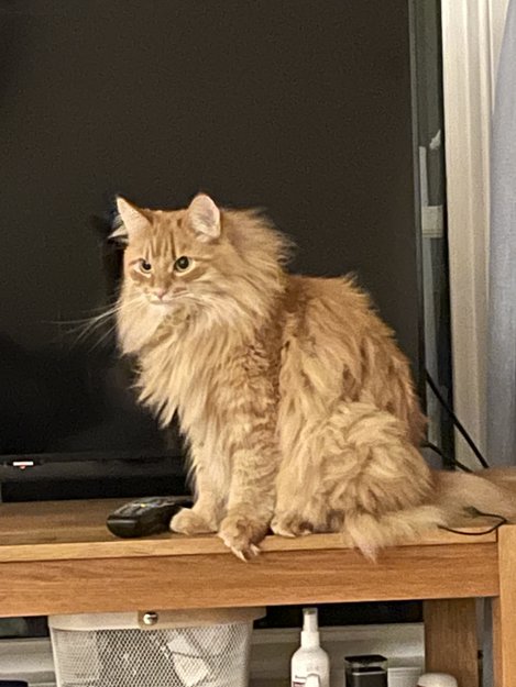 Han har en svart halsbånd med bjelle. Han har også en ingravert name tag med tlf nummer til oss. Han er veldig sjenert.