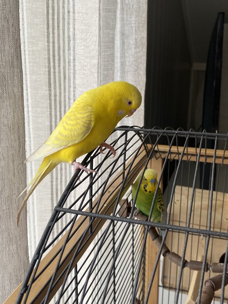 gul, med gråhvit hale og flyverfjær. sarish har svart røde øyne, hun er ikke tam, men kan komme på hånden og er veldig leken. hun er en smart undulat som har lært seg due lyder og kan lære seg andre lyder også.