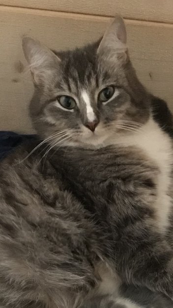 Gråhvit, strippet, ikke så stor hunnkatt , ikke sterilisert, hvit stripe på nesen