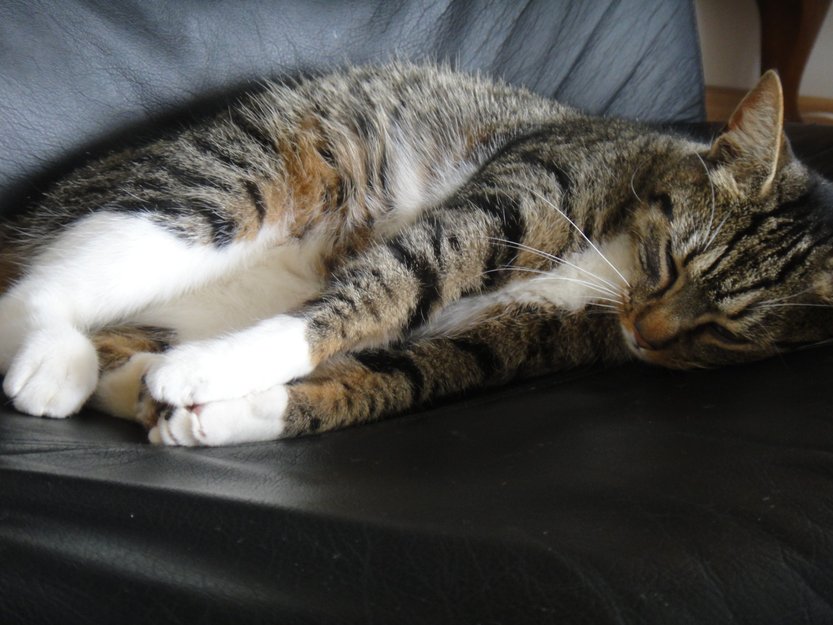 Beige pels med svarte striper og hvit mage. Mjauer lyst og høyt og er veldig kosete.