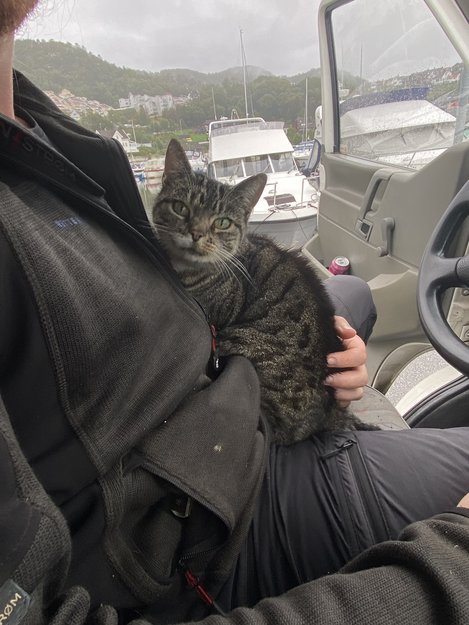 Har holdt seg til i sandvika båthavn i to uker nå. Veldig kosen å oppmerksomhetssøkende. Har en barbert flekk på ryggen.