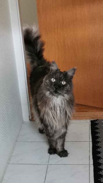 Det er en Maine coon, så han er ganske stor. Det mest spesielle ved han er at han har en lang, fluffy hale som er svart oppå og hvit/grå under.