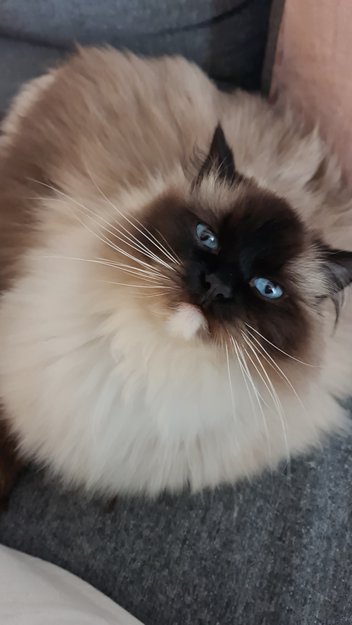 Hun mjauer sjeldent. Halen er samme farge som den mørke flekken i ansiktet.