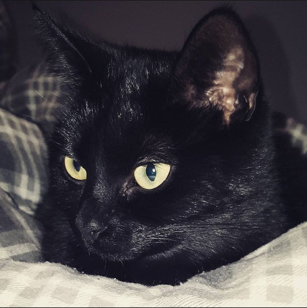 Frida er en sort korthåret katt. Hun har flere ekstra tær på forlabbene. Ett hvitt hårstrå på brystet.
