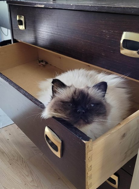 Brun i ansiktet, ørene, beina og halen. Hvit på kroppen og potene.