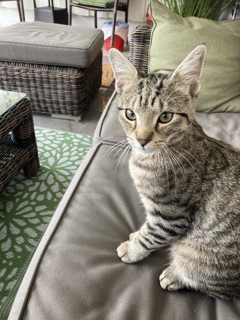 En veldig ung hannkatt går rundt i området og mjauer. Den er kjærlig og kontaktsøkende og hører tydelig til et hjem.