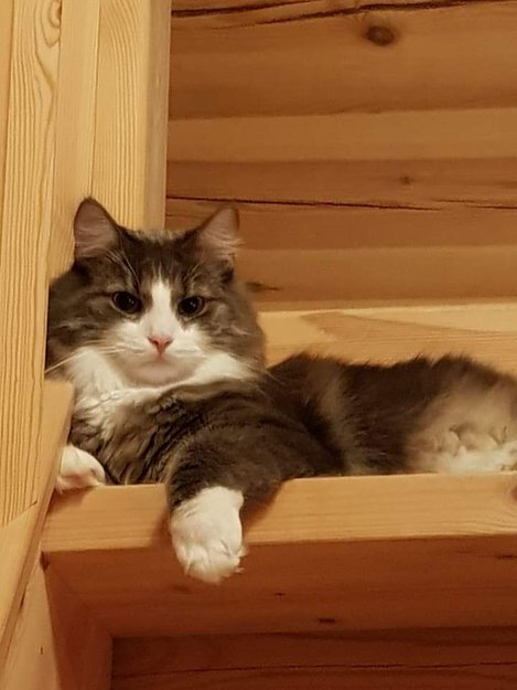 Mio er en kastrert hannkatt. Han er langhåret grå farge på kroppen og hvit i ansikt, hals og mage. Han veier ca. 4 kg og er 5.5 år. Ha er kjælen. Vi kaller på ham med plystring.