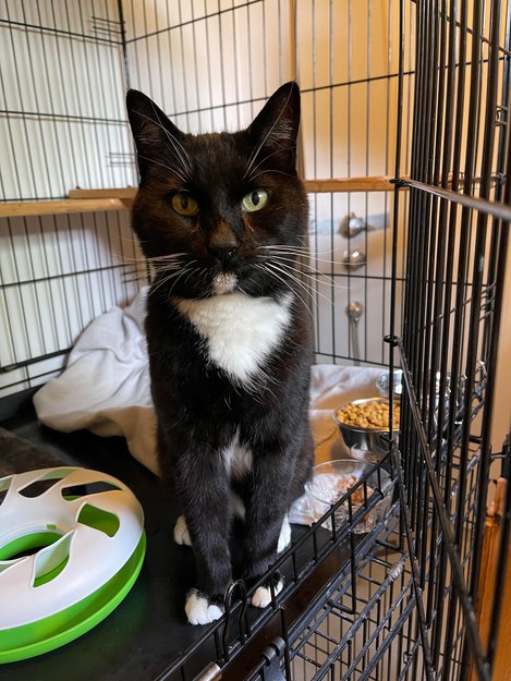Sort med noe hvitt kastrert hannkatt funnet i Homborsund. Han har øremerking, men vi finner ingen chip. Veterinær skal undersøke nærmere.