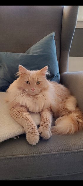 Sosial og pratsom beige langhåret katt. Blanding av maine coon i seg.
