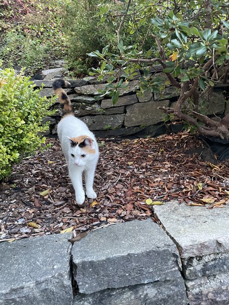 Katten dukket opp i hagen, mjauer fortvila og virka til å ha gått seg vill. Den er veldig kjælen og kontaktsøkende så den har nok en heim.