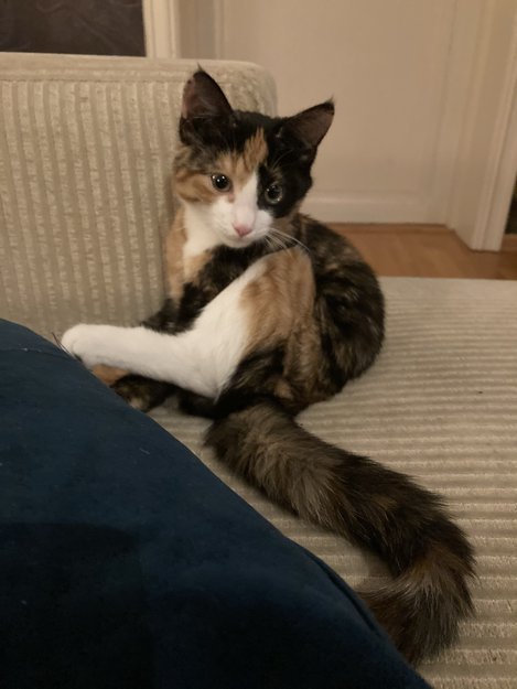 Hun er ganske lite for alderen 3 år og har en ekstra tå på begge fiorlabbrene