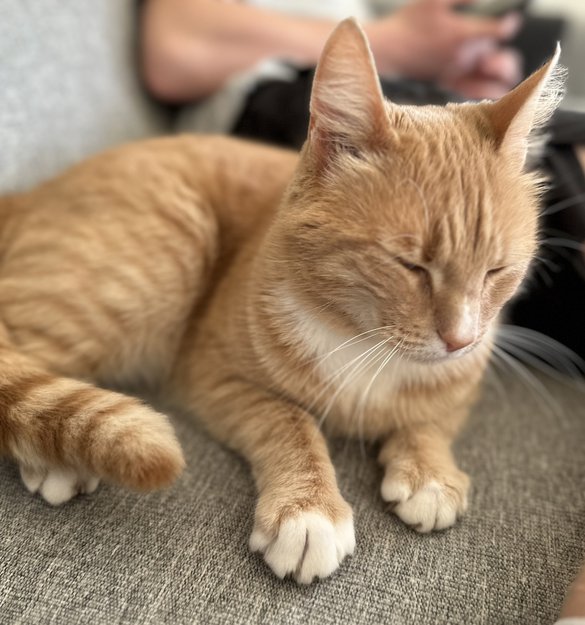 5 år gammel rødhåret hannkatt med hvite partier på hake, bryst, poter og haletupp. Stripete pels og gulbrune øyne. Veldig kosete og sosial. Blir lett skremt av skarpe lyder eller brå bevegelser. ID-merket i øret og har ikke halsbånd.