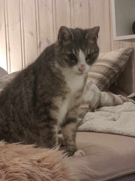 Sår på nesen, har begynt å gro. Tigerstripet, gråmelert, med beige innimellom.
