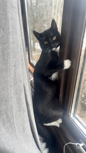 Svart med hvit pels på poter, mage, bryst og hake. Litt lys pels i pannen.