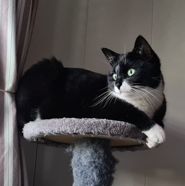 Hun er sort med hvitt på hals og rundt nesen. Sort nese. Litt hvitt på magen og hun har hvite sokker. Hun er ikke så stor. 3 1/2 år. Hun er skeptisk til nye folk, og hun holder trolig avstand. Veldig kosete når hun er trygg. God jeger.