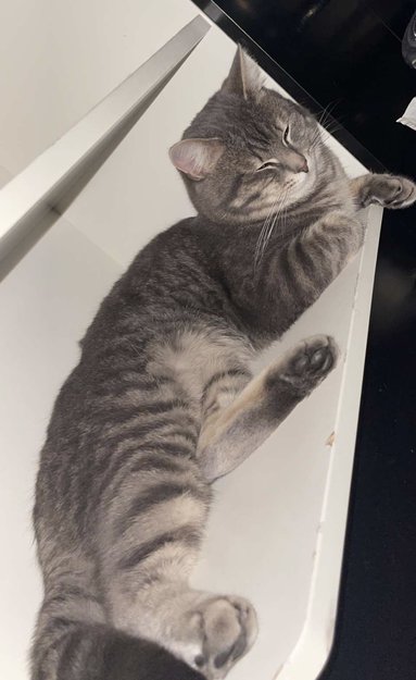 Han er en 2 år gammel Hann katt, mørk grå i pelsen med lys grå striper, veldig sky av seg men også nyskjerrig. Han er ikke chippet og har ikke halsbånd.