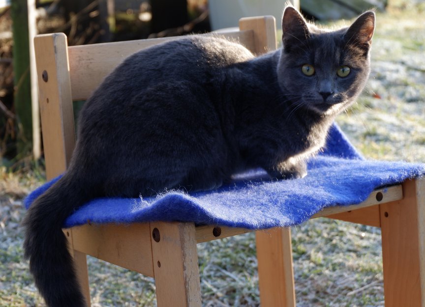 Liten, rolig og snill katt. Koksgrå, ensfarget, korthåret.