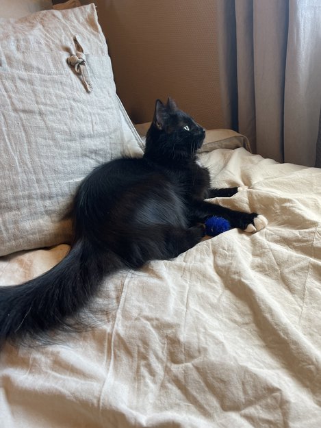 Liten katt, sort men hvit foran og på potene. Så si grønne øyne. Lang pels og fin lang pels på hale
