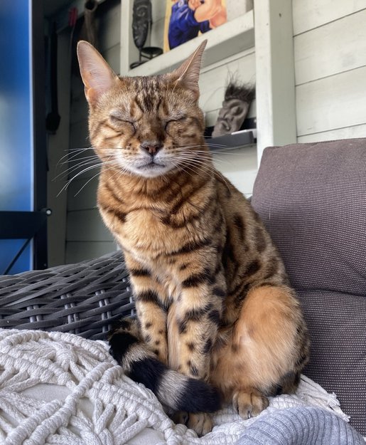 Rødlig/oransj pels med leopard mønster. Grønne øyne. Litt hovne mysende øyne. Liten jente. Nyskjerrig og veldig pratsom. Kan følge etter folk.