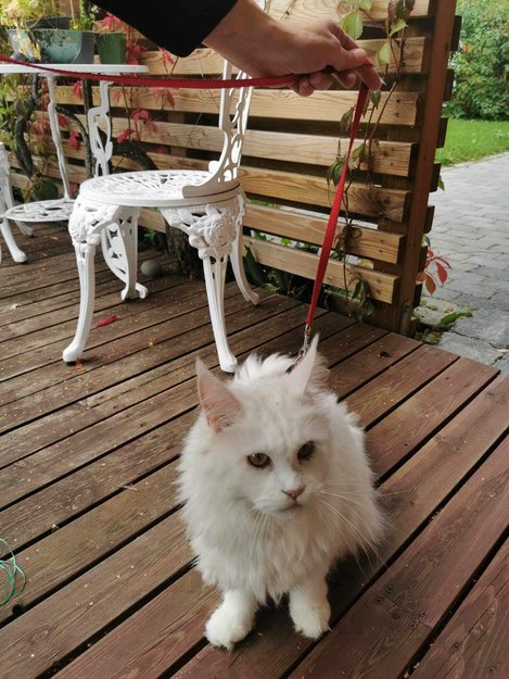 Hvit, stor katt med rød sele dukket opp hos oss på Tongjordet.