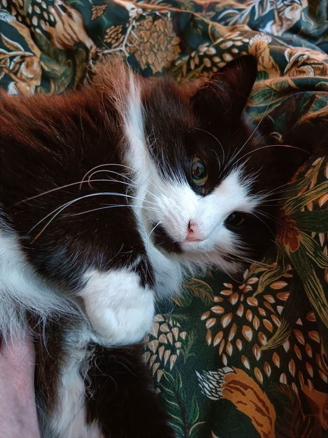 Sort og hvit med sort hake hvite labber og hvit under mage og ansikt , store gule øyne og lys rosa nese , hun er generelt redd for fremmede men ikke oss hjemme , hun pleier og følge etter oss hvor en vi går men vi ser ingen tegn til henne de stede vi pleier å gå