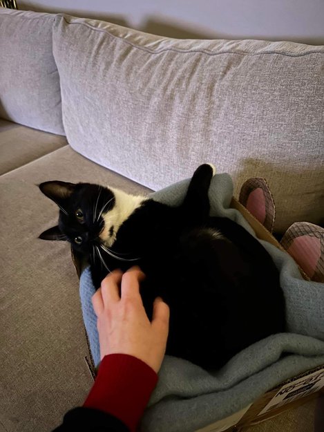 «Skipskatt» svart tynnhåret med hvit stripe under magen. Har i tillegg en tydelig svart flekk under haken på den hvite pelsen.