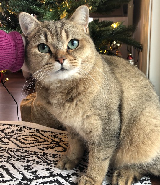 Grønne øyne, hvit rundt munn og på hake, «M» i panna, oransjerød nese. Lys oransje mage. Ellers oransjebrun pels med svartspett i, og mye svart på halen. Litt liten for å være en 5 år gammel britisk korthår.