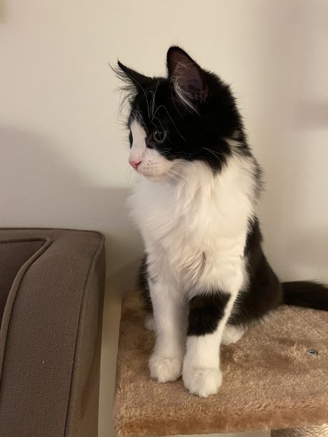 Svart og hvit. Hvite ben med en svart flekk på ene benet. Tynt «smykke» med hvit pels rundt halsen.