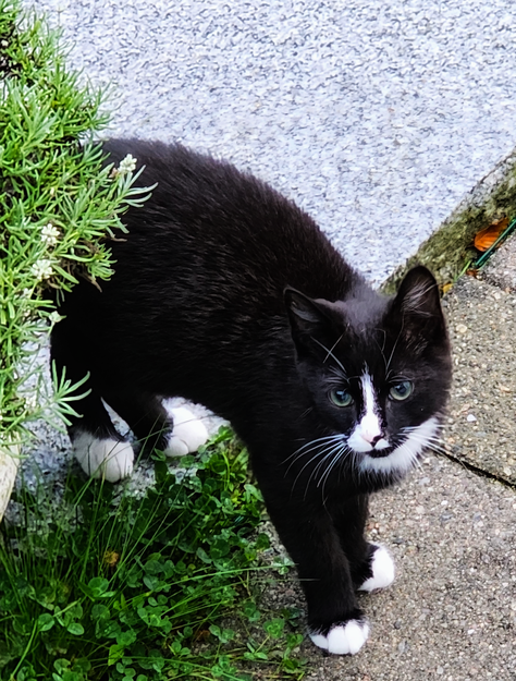 Sort kattunge med smal hvit nese, hvite poter og hvitt brystparti. Litt skvetten, men kosete. Antatt ca. 16 uker.
