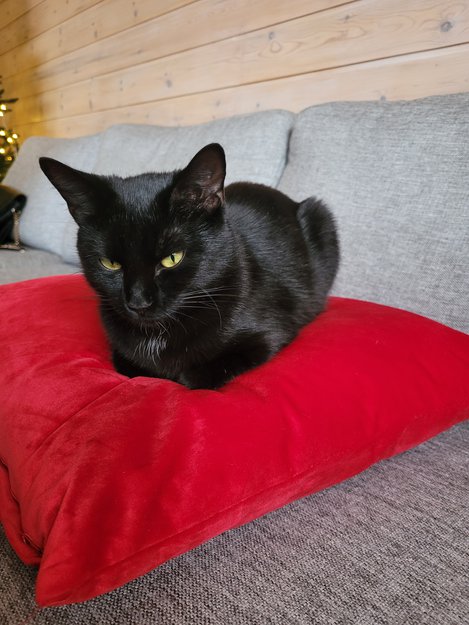 Har bitte litt hvitt på halsen/brystet. Og hun ble kastrert på starten av året og har ujevnt pels bak på sin venstre side. Litt vanskelig å se siden pelsen har vokst, men skal fortsatt være synlig.