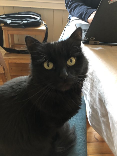 Hun har en liten hvit flekk under haken som hun har fått med alderen. Har også noen hvite hår på den store, bustete halen. Ellers er hun helt svart.