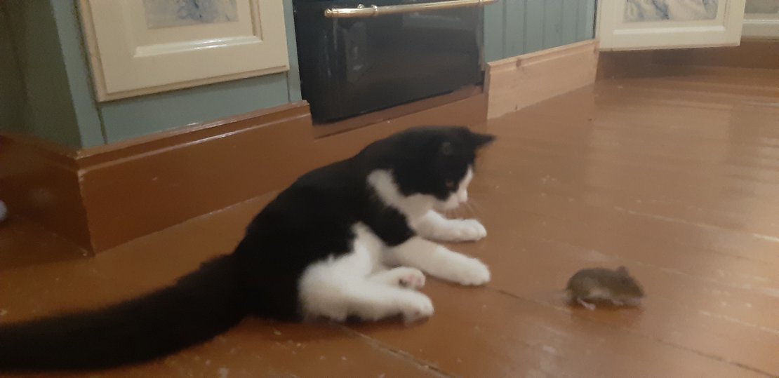 Veldig lang svart buskete hale, med lang pels. Svart på rygg, hode og hale. Hvit snute, bryst, mage og bein. Ett år