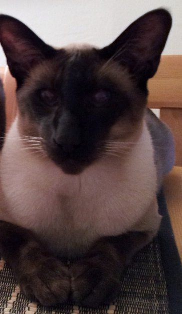 Siameser hannkatt. Han har store ører, lange bein og knall blå øyne. Han hadde et blått halsbånd på seg da han forsvant. Han mjauer høyt og dypt. 2 år og kastrert.