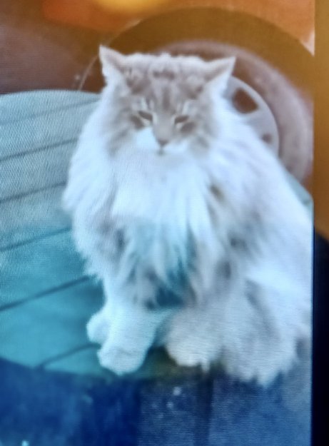 Norsk skogkatt som ble løveklippet i sommer pga varmen,og overpelsen er ikke ferdig utvokst enda. Så han er lysegrå og ullete,men halen er som den skal,med endel sorte overhår.Hvitt bryst og hvite ben nederst/ poter,hvit/lys på magen.Ikke så veldig stor manke.