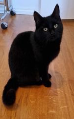 Hel svart og korthåret. 3 år. Sky og ikke av de største ho kattene.