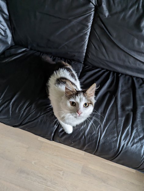 Liten. Lang, hvit og brun pels. Veldig kjærlig.