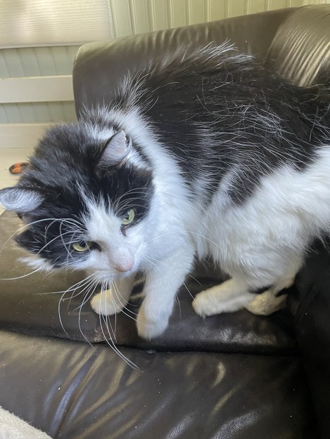 Nylig omplassert katt som ikke skulle vært ute, kom ut og tilbake (mjauet på døra). Da han skulle slippes inn ble han skremt av ankomsten til to mennesker. Han er redd folk, spessielt menn.