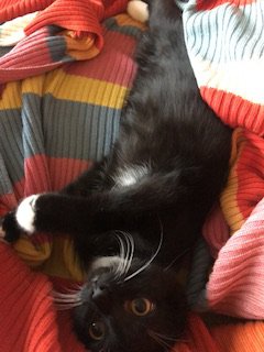 Kattunge, 3 1/2 måned. Nesten helt sort. Hvit på hake og litt hvit øverst på magen. Hvit på poter.