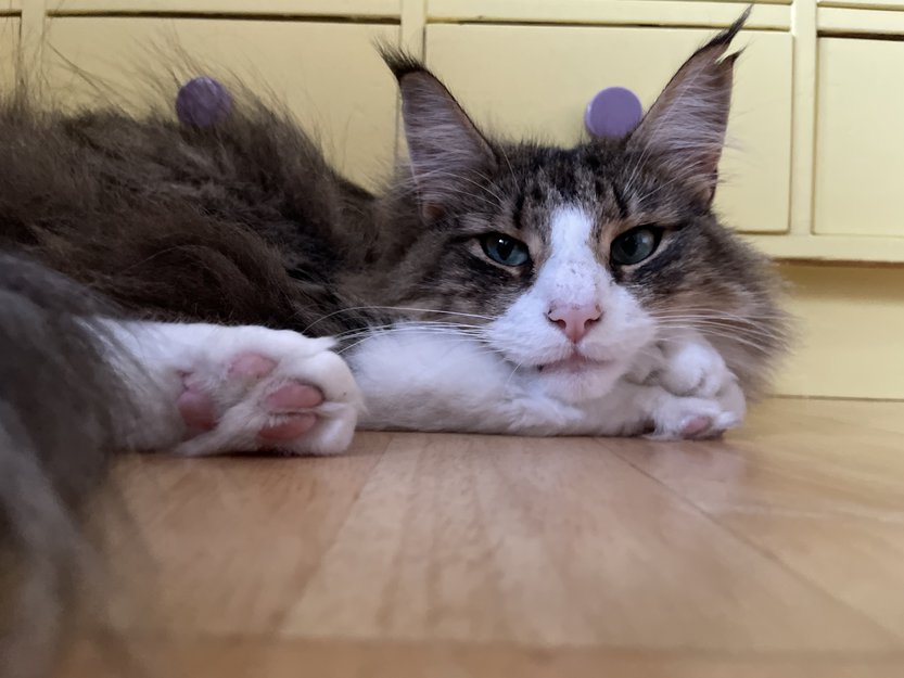 Han er en norsk skogskatt med hvite beina og hvit nes. Langt hår og lang hale. Han har et lite såre på venstre øre.