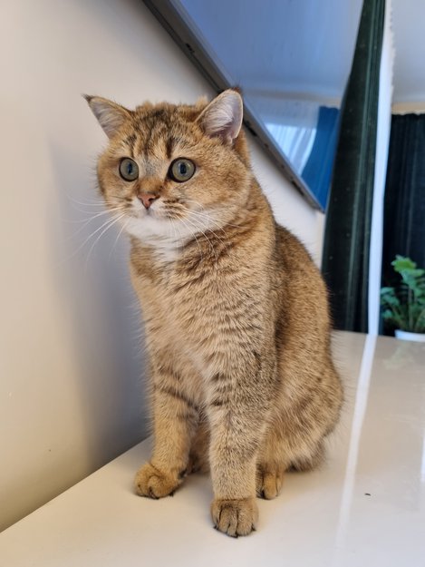 Britisk korthår farge ny11, golden, brunn,med svart "slør", ett års gamle.