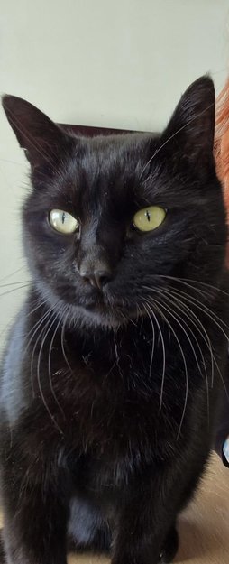 Svart, kakk i høyre øre, liten knekk på haletuppen. Fluffy pels og noe chubby (tykk). Kastrert og chippet. Har hatt et stort sår på hode, så mulig arr under pelsen oppå hodet.