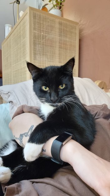 Kontaktsøkende og nysgjerrig. Brune øyne og ganske tykk, lang hale. Hvite bakbein- en stor sort flekk bak venstre bein og en liten sort flekk bak høyre bein.