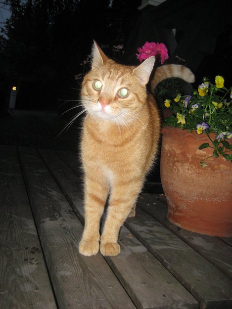 VELDIG kontaktsøkende, vil inn i huset, veldig snill og kosete. Funnet ved 19/20-tiden, og mjauer fortsatt utenfor huset. Orange med tigerstriper, hvitere haletupp og hvitere under haken. Lysegrønne øyne. Har noen små rifter på ørene.
