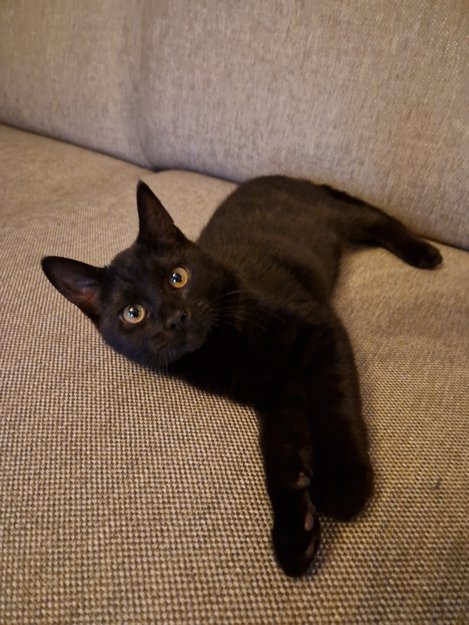 Han er liten svart katt, fortsatt kattunge. Han er svakt tigret i riktig lys.