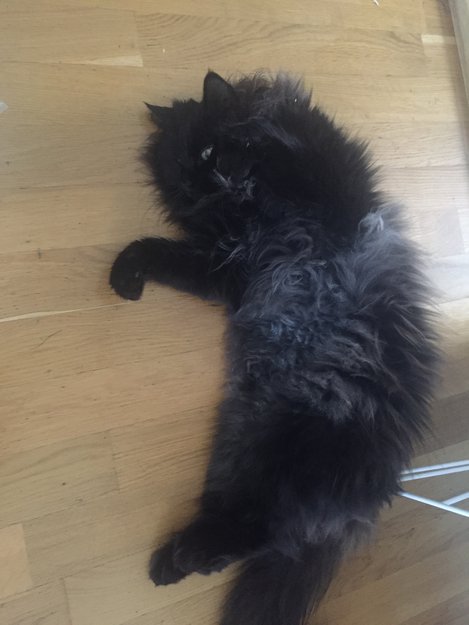 Gulla er en blanding av Main Coon og norsk skogkatt. Hun er en stor hunnpus med lang pels. Hun har vondt i magen nå og vil nok kreke seg sammen. Hun er barbert litt på sidene og på en flekk på frampoten.