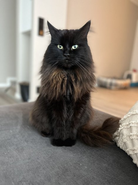 Svart katt med lang pels, han er også barbert litt på halen etter dyrelegebesøk