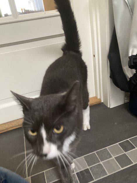 Svart katt med hvite sokker. Hvit på magen og halve nese/munn.